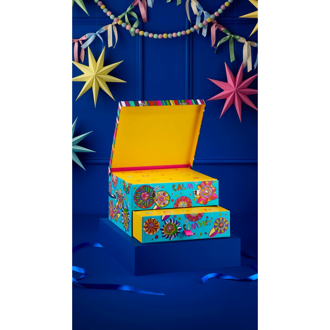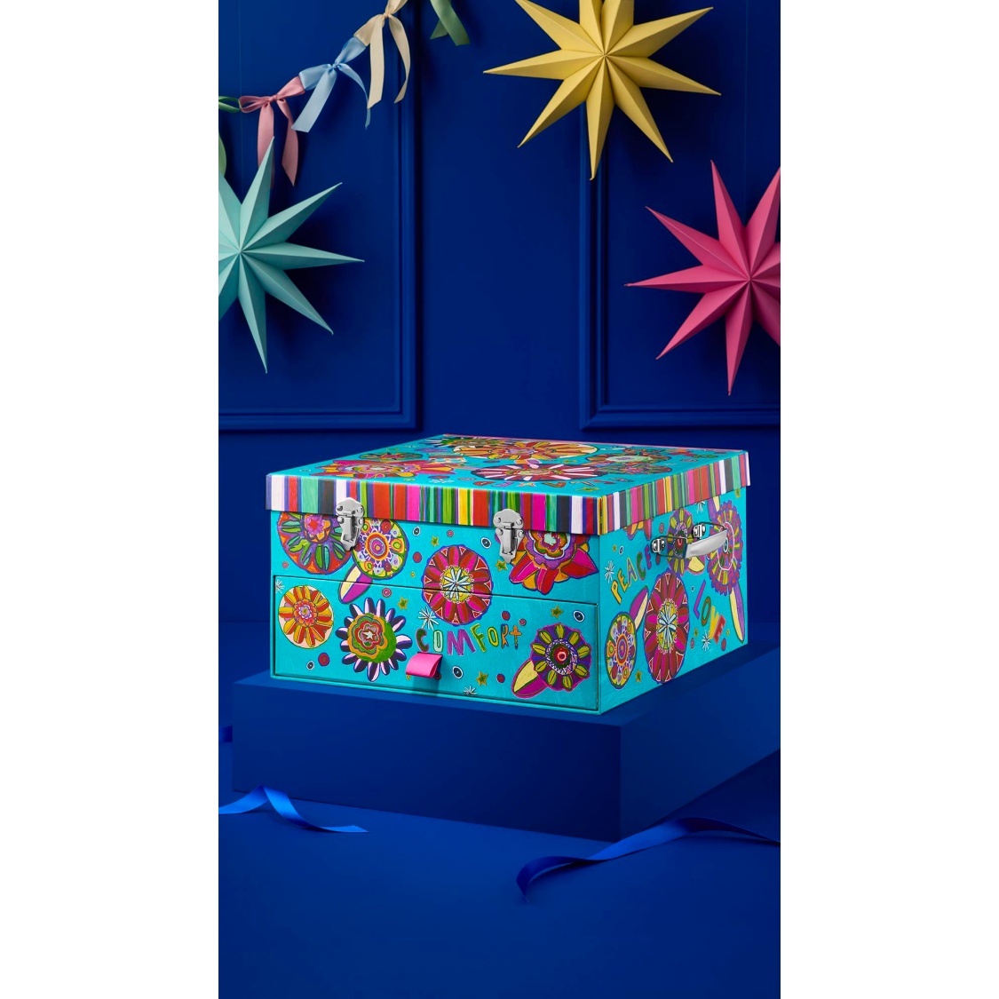 The artwork on this box was created by Shruti Gadhvi, an artist who works with Artbox. Artbox London is a registered charity and social enterprise that runs a programme of art workshops to allow those with learning disabilities and neurodivergent artists to explore their creative interests and develop their artistic skills. Shruti says, “When I’m in my area in London and on holiday, I see lots of flowers and colour and this gives me ideas for my art. In Artbox I found a book on meditation and combined the flowers and colours with positive words and mandalas to create this piece. The words make my mind and body feel calm and then I feel the flow inside the body when making the art.”