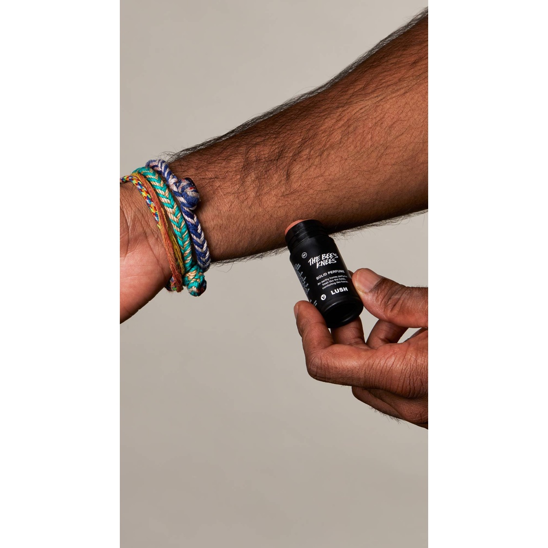 Push up gently, apply to your pulse points and massage in. Use your wrist to gently push the perfume back into its packaging. You can also fragrance your hair by working between your fingers and applying to the ends rather than the scalp.